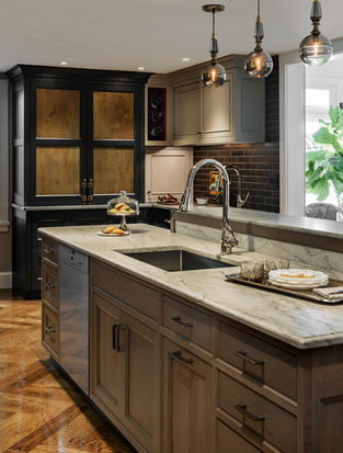 To achieve the dramatic look desired we selected rich materials including quarter-sawn oak in multiple finishes; one being a red stain for small pops of color. Leathered quartzite has the perfect aged look on the countertops and at the splash. The addition of mixed metal adds character. The polished hood, antiqued brass etagere, hammered metal fusion doors at the smoothie cabinet, metallic tile and other small metal details make this space intriguing. Wooden block tiles with metal accents create an interesting pattern at the island back. Herringbone hardwood floors and unique lighting finish the look.