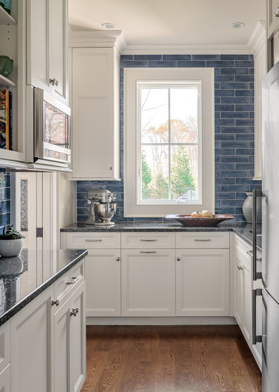 This ocean view kitchen, in southern Maine, combines modern elegance and classic charm with white custom cabinetry, a navy stained island, and patterned blue and white backsplash tiles. Statement gold pendant lights and hardware enhance the coastal vibes.